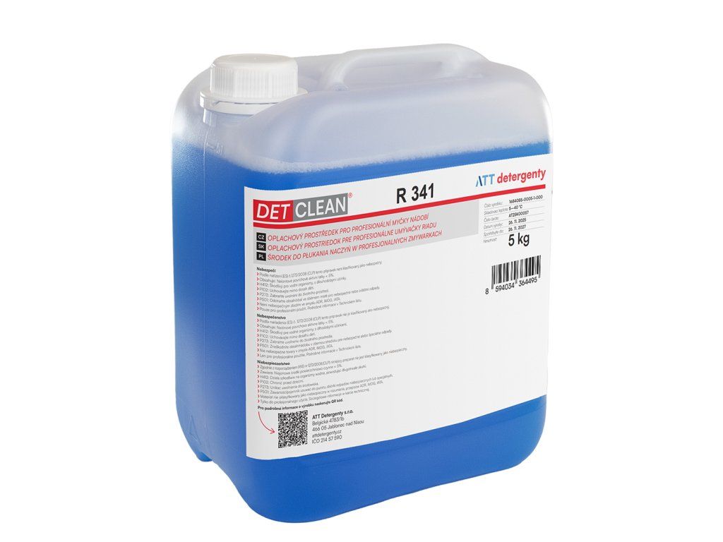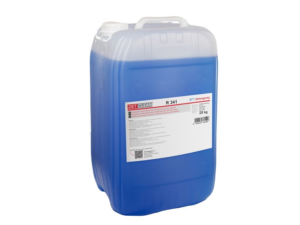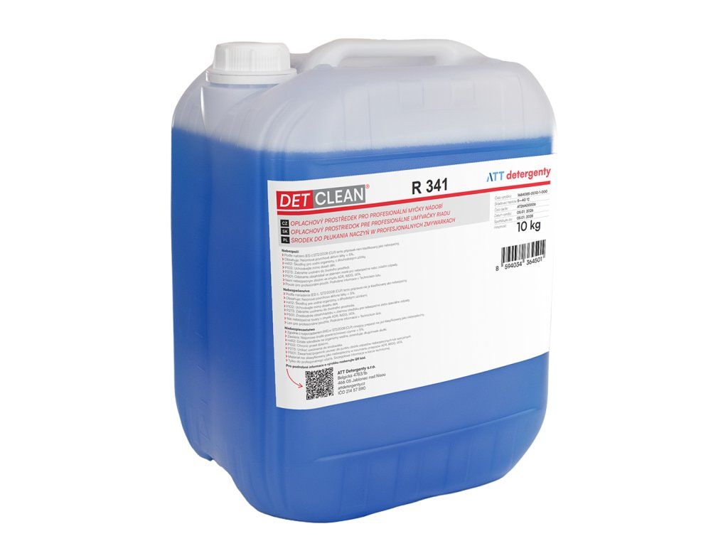 DETCLEAN R 341 je slabě kyselý oplachový a lešticí přípravek pro průmyslové myčky nádobí, vhodný pro všechny typy myček a mytých předmětů, zejména při použití v měkké a středně tvrdé vodě. Tento přípravek je nezbytný pro finální oplach zbytkových usazenin minerálních látek na nádobí, příborech a sklenicích při strojním mytí.