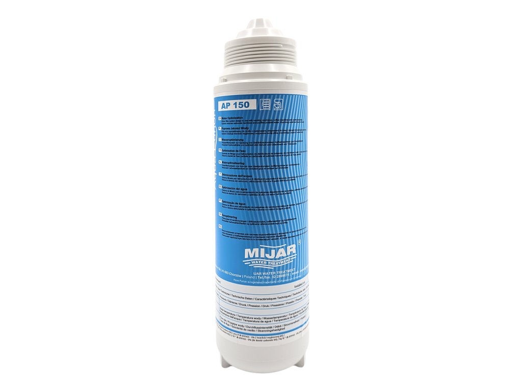 AP 150 náhradní cartridge je výměnná filtrační vložka pro systém Aqua Purion AP 150. Z vody odstraňuje uhličitany způsobující tvrdost, zlepšuje chuť a vůni pitné vody a chrání zařízení před tvorbou vodního kamene. Výměna kartuše se provádí podle tvrdosti vstupní vody nebo při dosažení maximální kapacity filtru. Kompatibilní s průtokoměrem DigiFlow, který umožňuje sledovat kapacitu filtru a upozorní na nutnost výměny.